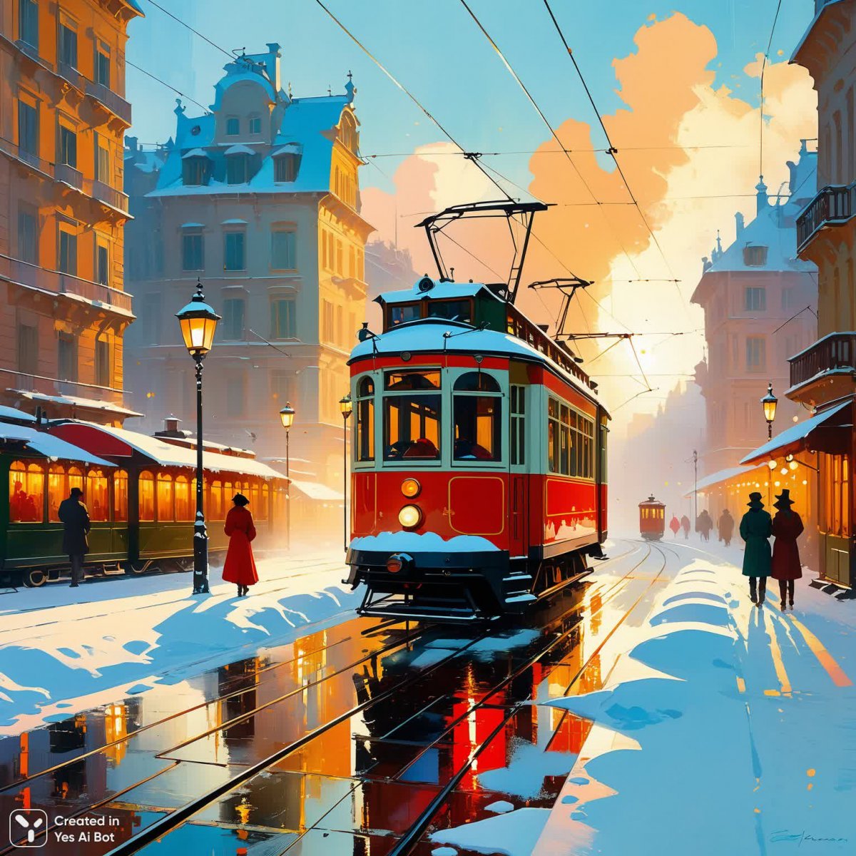 Заснеженный старинный трамвай застыл в объятиях зимней сказки – величественный символ ушедшей эпохи, окутанный таинственной красотой. Монументальные колеса утопают в толстом слое инея, а из-под корпуса поднимаются клубы ледяного пара, растворяясь в морозном воздухе. Городские фонари бросают теплые золотистые отблески на нетронутые сугробы, создавая контраст с холодной палитрой пейзажа. Фон размывается в абстрактные геометрические формы, намекая на городскую застройку и погружая зрителя в атмосферу загадочности. Анимированные снежинки танцуют в воздухе, а искаженные отражения в ледяных окнах добавляют сюрреалистичности этой зимней картине. Мастерски выполненные мазки, напоминающие стиль Исаака Левитана, придают изображению глубину и эмоциональность. Насыщенные холодные цвета, с яркими акцентами алого, подчеркивают драматизм момента. Глянцевые эмалевые текстуры на металлических поверхностях трамвая создают ощущение реалистичности и тактильности. Удлиненные пропорции трамвая добавляют композиции необычный визуальный ритм. Слышится отдаленный перезвон колоколов, усиливающий атмосферу умиротворения и ностальгии. Это захватывающее цифровое произведение искусства сочетает в себе элементы компьютерной графики и живописи, создавая неповторимый мир заснеженного города, где время словно остановилось. Изображение обладает высоким разрешением 1024K, что позволяет рассмотреть каждую деталь этого волшебного пейзажа