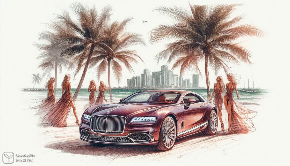 Автомобиль лакшери класса, типа Lincoln, 2х местный, цвет глубокий бургундский перламутр, он на песчаном пляже в Майями и рядом очень красивые блондинки, на которых мало одежды. Стиль рисунка скетч акварель, тонкая обводка, очень ярко.