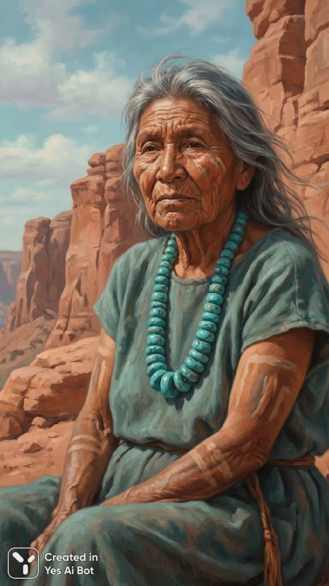 Лицо, изрезанное временем и мудростью, обрамлено седыми прядями волос, колышущимися под жарким ветром. Глубокий загар подчеркивает связь с землей, а на коже видны узоры, нанесенные натуральной глиняной краской – свидетельство древних традиций и духовных практик. Мощное ожерелье из бирюзы, кажущееся непропорционально большим, словно символ наследия и стойкости, привлекает внимание своей насыщенностью цвета и ремесленной работой. На фоне раскаленных солнцем красных скал и бескрайнего голубого неба создается ощущение вечности и неразрывной связи с природой. Грубая текстура камня и земли передает ощущение реальности и подлинности момента, а едва слышное жужжание насекомых добавляет атмосферы жаркого дня в дикой местности. Эта работа, выполненная в манере чувствительного реализма Марии Уайт, словно запечатлевает душу древней женщины, хранительницы знаний и традиций своего народа, воплощая в себе силу духа и красоту единения с природой. Изображение вызывает глубокие эмоции и позволяет почувствовать связь поколений, а также осознать важность сохранения культурного наследия и уважения к старшим. Внимание к деталям – от морщин на лице до текстуры камня – создает эффект присутствия и погружает зрителя в атмосферу этого уникального места и времени. Использование CGI позволило передать мельчайшие нюансы освещения и текстур, создавая реалистичное и захватывающее изображение