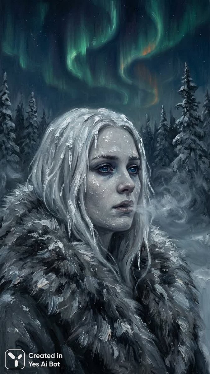 Затерянная в зимней сказке скандинавская красавица воплощает собой хрупкую силу и величие северной природы. Ее бледное лицо, словно вылепленное из снега, обрамлено длинными платиновыми волосами, усыпанными мелкими сосульками – свидетельством морозного дыхания зимы. Глубокие синие глаза, полные задумчивости, отражают таинственное северное сияние, словно храня в себе секреты древних скандинавских саг. На фоне заснеженного леса из елей под бездонным сапфировым небом она предстает одинокой и прекрасной – олицетворением суровой красоты севера. Густой фактурный меховой воротник, написанный словно живыми мазками кисти, добавляет образу драматизма и подчеркивает связь с диким миром. Приглушенные серые и ледяные голубые оттенки создают атмосферу холода и отрешенности, а яркие изумрудные акценты северного сияния пронзают мрак, словно надежда на возрождение. Вертикальная композиция усиливает ощущение высоты и вечности, а заметное дыхание в морозном воздухе и шепот ветра оживляют картину, делая ее почти осязаемой. Стиль, вдохновленный Эдвардом Мунком, придает изображению экспрессивности и глубины, передавая внутренний мир героини – сложную смесь тоски, силы и неразрывной связи с суровой северной природой. Это портрет, запечатлевший момент тишины и созерцания в царстве вечной зимы