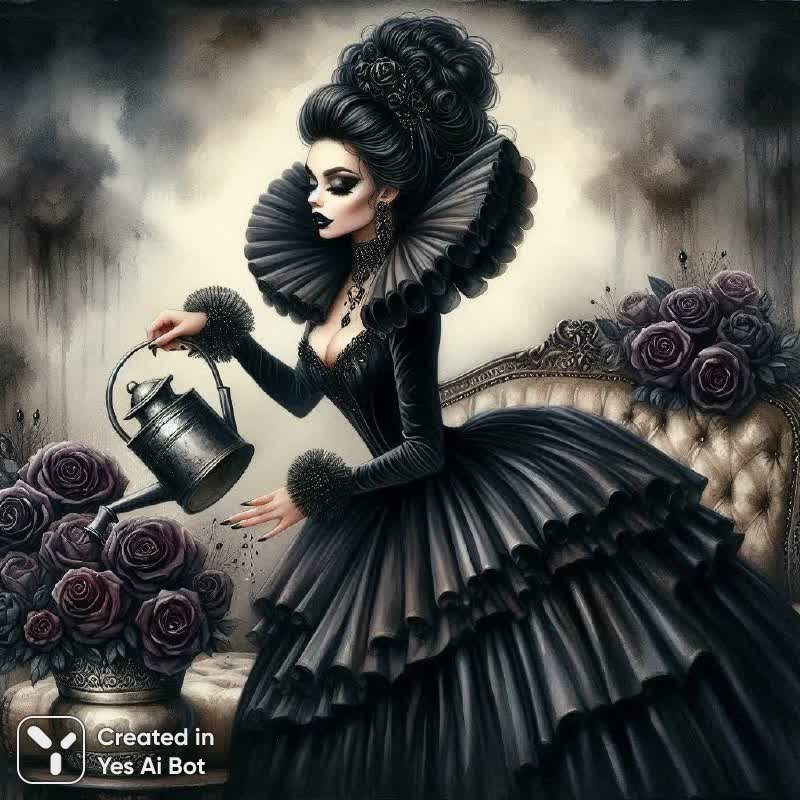 Загадочная красавица в готическом образе, запечатлённая в смешении акварели и акрила, воплощает атмосферу таинственности и меланхолии. Брюнетка с уложенными воском волосами, подчеркнутыми тёмной помадой, предстаёт перед зрителем в изысканном чёрном корсете, украшенном широким воротником-мех, и короткой пышной юбкой. Черные чулки и элегантные туфли на высоком каблуке завершают её утончённый образ. Она стоит с прямой осанкой, слегка наклонившись над роскошной грядкой тёмно-бордовых и чёрных роз, заботливо поливая их потемневшим от времени серебряным антикварным лейки. За её спиной возвышается мрачный готический замок, словно символ ушедшей эпохи и скрытых тайн. Сумеречное небо с бледным лунным светилом добавляет картине драматизма и загадочности, создавая ощущение вневременности и мистической привязанности к прекрасному, но печальному миру готики. Вся композиция пронизана тонкой грустью и элегантной мрачностью, делая её не только визуально привлекательной, но и эмоционально насыщенной. Это портрет хрупкости и силы, красоты и тайны, запечатленный в изысканной манере живописи, сочетающей в себе нежность акварели и выразительность акрила. Идеальное воплощение готического стиля в искусстве