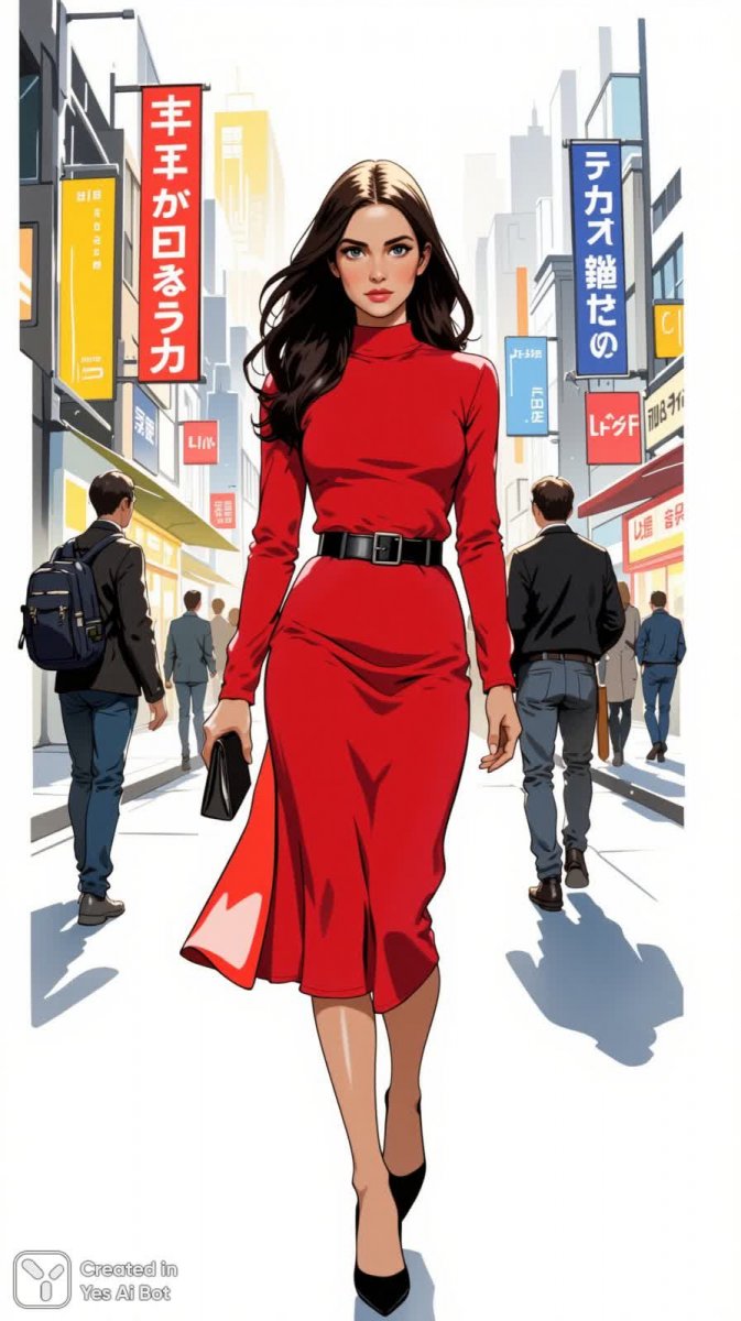 Элегантность в красном: городской стиль и акварель - Пример изображения из нейросети Flux Ai