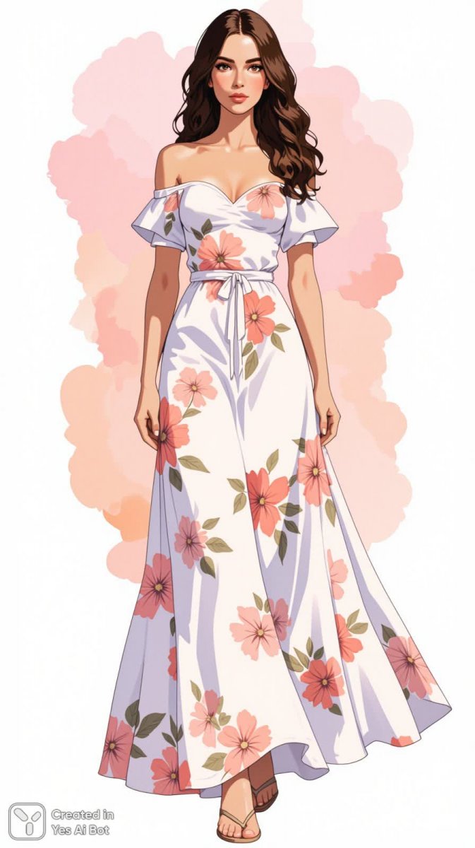 Нежная акварельная иллюстрация воплощает собой романтический образ женщины в роскошном платье-макси с цветочным принтом. Легкая ткань ниспадает мягкими складками, подчеркивая талию и создавая ощущение воздушности и невесомости. Детали платья – пышные рукава и изящный вырез сердечком – добавляют образу женственности и шарма. Ножки украшены деликатными сандалиями, а длинные волосы, уложенные в волну, обрамляют лицо, придавая взгляду мечтательность и загадочность. Фоном для этой картины служит нежный пастельный градиент, словно акварельная роспись, который усиливает общее ощущение легкости, романтики и безмятежности. Изображение излучает теплоту, спокойствие и утонченную красоту, передавая атмосферу весеннего сада или летней сказки. Это визуальное воплощение хрупкости и очарования женской души, запечатленное в нежных акварельных тонах, способное вызвать чувство восхищения и вдохновения. Картина идеально подойдет для оформления интерьера, обложки книги или как иллюстрация к романтической истории, наполняя пространство атмосферой мечтательности и утонченного вкуса