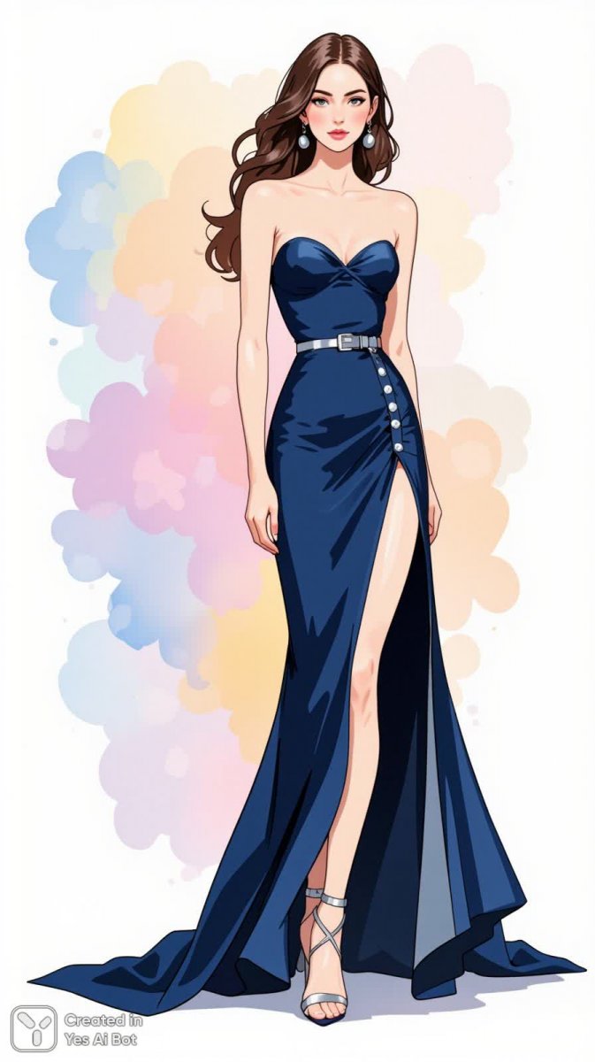 Изящная акварельная иллюстрация моды изображает женщину в роскошном струящемся темно-синем платье с высоким разрезом, подчеркивающим ее изящную фигуру. Платье выполнено в стиле без бретелей с нежной вырезной линией 'сердечко', создающей романтичный и женственный силуэт. Талию элегантно акцентирует серебряный пояс, добавляющий блеска и завершенности образу. Волосы женщины уложены в свободные волны, мягко ниспадающие на плечи, придавая ей воздушность и естественность. Ее ноги украшают изящные серебристые туфли на тонких ремешках, гармонично сочетающиеся с поясом и создающие ощущение легкости и грации. Фоном для этой завораживающей картины служит нежный пастельный градиент, который подчеркивает красоту и воздушность модели, создавая атмосферу мечтательности и утонченности. Общее впечатление – это воплощение элегантности, женственности и изысканного вкуса, выполненное в деликатной акварельной технике, передающей легкость и прозрачность красок. Иллюстрация излучает спокойствие и уверенность, делая акцент на красоте линий и нежных тонах. Это прекрасный пример современного модного искусства, сочетающего классическую элегантность с современными тенденциями в дизайне одежды