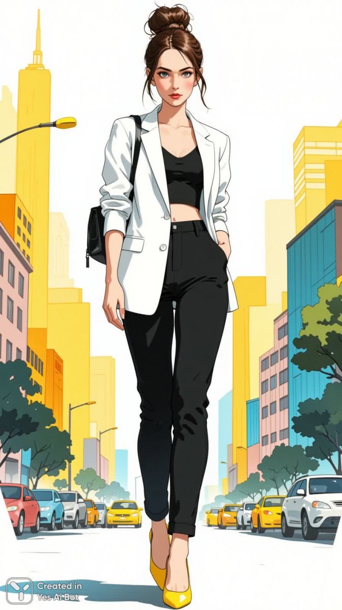 watercolor fashion illustration of woman dressed in oversized white blazer and high-waisted black trousers, paired with a black crop top, wearing bright yellow heels, hair in a messy bun, BG is vibrant cityscape.