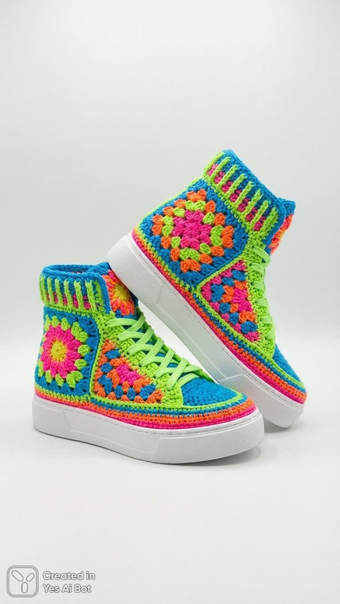 Кроссовки хай-топ выполнены в ярких неоновых тонах с использованием техники вязания крючком, что создаёт сложную текстуру и узорчатый рисунок. Дизайн обуви отражает энергичный молодежный стиль и современные модные тенденции. Сочетание насыщенных цветов и замысловатой вязки формирует эффектный внешний вид, привлекающий внимание своей оригинальностью и смелостью. Данная модель идеально подходит для создания ярких и запоминающихся образов в повседневной жизни, подчеркивая индивидуальность владельца и его любовь к моде. Белый фон акцентирует внимание на деталях кроссовок, демонстрируя богатство текстуры и цветовой палитры. Обувь представляет собой взрыв креативности, сочетающий в себе удобство, стиль и последние тренды модной индустрии, предназначенный для тех, кто стремится выделиться из толпы и выразить свою уникальность через одежду и обувь. Кроссовки станут отличным дополнением к любому гардеробу, добавляя яркий акцент и завершая образ современного городского жителя. Изображение создано нейросетью Nano Banana с использованием простого белого фона для максимальной концентрации на деталях обуви.