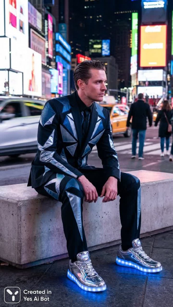 Смелое сочетание уличного стиля и элегантности в динамичном ночном городском пейзаже. Профессиональная фотография запечатлевает образ уверенного в себе мужчины, одетого с футуристической изюминкой. Его безупречно сидящий костюм украшен смелыми геометрическими узорами, создающими эффектный контраст со строгим силуэтом. Акцент на деталях: идеально приглаженные волосы и пара экстравагантных серебристых кроссовок с LED-подсветкой, излучающих футуристический свет. Эта обувь – не просто аксессуар, а заявление о себе, подчеркивающее прогрессивный взгляд на моду. Яркий городской фон добавляет динамизма и глубины снимку, отражая энергию современного мегаполиса. Композиция фотографии идеально сбалансирована, демонстрируя гармоничное сочетание классического стиля и дерзких элементов уличной моды. Образ воплощает собой смелость, инновации и безупречный вкус. Фотография представляет собой визуальную оду современной моде, где традиции переплетаются с авангардом, создавая неповторимый и запоминающийся стиль. Это не просто одежда – это способ выразить свою индивидуальность и заявить о себе миру. Каждое решение в образе продумано до мелочей, от кроссовок до узора на костюме, чтобы создать целостный и эффектный ансамбль. Этот снимок - манифест свободы самовыражения через моду, вдохновляющий на эксперименты и создание собственного уникального стиля