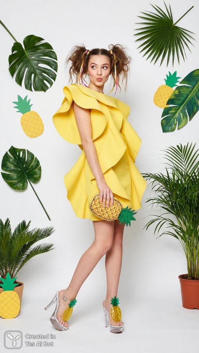 professional photo, crazy body kit fashion design, girl in a playful outfit with pineapple-shaped heels, vibrant yellow dress with frill details, hair styled in playful pigtails, BG is a simple white canvas with tropical elements.