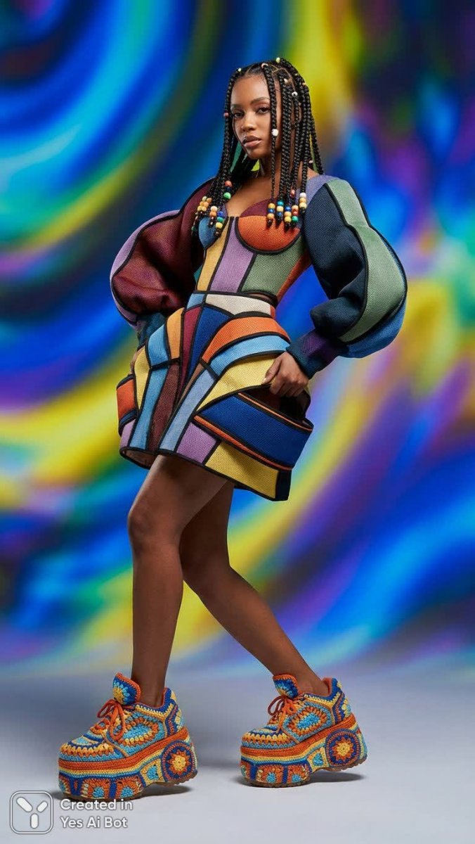 professional photo, crazy body kit fashion design, woman in bold vibrant outfit featuring chunky sneakers with detailed crochet patterns, hair styled in tight braids, exaggerated sleeves on a fitted top, BG is an abstract blend of vivid colors.