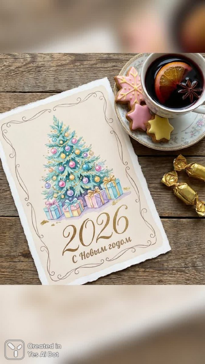 Изысканная новогодняя открытка, словно сошедшая со страниц зимней сказки, приглашает окунуться в атмосферу праздника и волшебства. Нежный бежевый фон служит идеальным полотном для яркой палитры: свежий цвет Тиффани гармонично сочетается с нежными оттенками пинка, солнечного желтого и утонченного лавандового, создавая ощущение легкости и радости. Изящный темно-бежевый орнамент, деликатно обвивающий периметр открытки, добавляет нотку элегантности и завершенности композиции. В центре внимания – крупные цифры 2026, символизирующие грядущий год, а надпись С Новым годом! передаёт искренние пожелания счастья и благополучия. Открытка эффектно расположена на текстурированной деревянной столешнице, демонстрируя вид сверху, который позволяет рассмотреть все детали с максимальной точностью. Рядом уютно примостилась прозрачная чашка с ароматным глинтвейном, согревая теплом и создавая ощущение домашнего уюта. На фарфоровом блюдце аппетитно разложены имбирные пряники, украшенные яркой розовой и желтой глазурью, а рядом сверкают конфеты в золотых обёртках, добавляя сладости и праздничного настроения. Эта открытка – прекрасный способ поздравить близких и разделить с ними радость наступающего Нового года, подарив частичку тепла и волшебства. Идеальный выбор для тех, кто ценит красоту, изысканность и атмосферу настоящего зимнего праздника