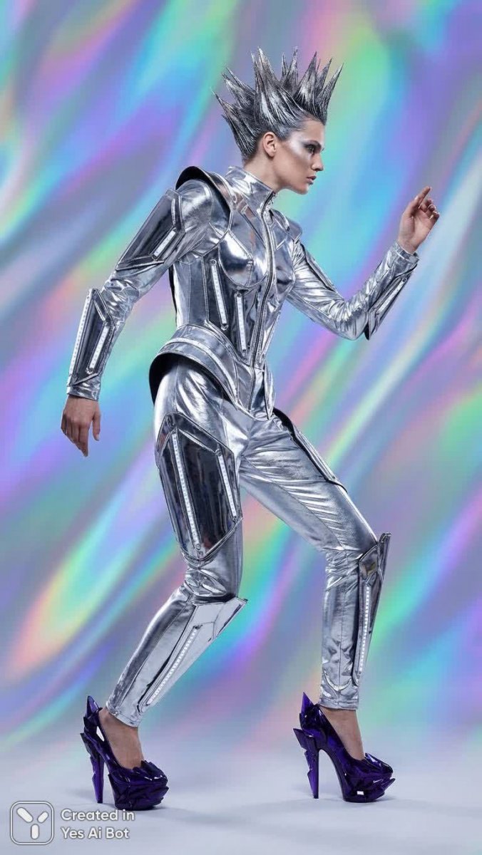 Яркий образ будущего, сотканный из смелых дизайнерских решений и дерзкого стиля. Профессиональная фотосессия представляет собой захватывающее сочетание моды и технологий, где безумный боди-кит гармонично переплетается с авангардным дизайном одежды. Центральным элементом композиции являются потрясающие туфли на высоком каблуке насыщенного фиолетового цвета, напоминающие осколки обсидианового кристалла – воплощение роскоши и футуризма. Стильный металлический серебряный костюм подчеркивает динамичность образа и создает эффект жидкого металла, а прическа в виде острых, как лезвие, шипов добавляет бунтарский дух и завершает ансамбль. Фон фотосессии представляет собой абстрактное переплетение голографических узоров, создающее ощущение погружения в цифровой мир. Цветовая палитра, сочетающая насыщенный фиолетовый, холодный серебристый и мерцающие оттенки голограммы, усиливает эффект нереальности происходящего. Вся композиция излучает уверенность, инновационность и стремление к передовым технологиям в мире моды. Это визуальное заявление о свободе самовыражения и готовности ломать стереотипы, демонстрируя уникальный взгляд на будущее стиля и красоты. Фотография запечатлевает момент триумфального слияния искусства, дизайна и технологий, предлагая зрителю окунуться в мир невероятных фантазий и безграничных возможностей. Это не просто фотография – это манифест новой эры моды, где нет места компромиссам и ограничениям