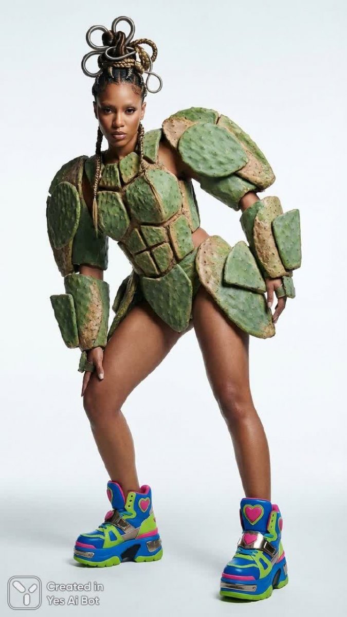 Яркий портрет современной женщины, воплощающей смелый стиль и инновационный дизайн. Фотография демонстрирует уверенную в себе девушку в экстравагантном наряде, который сочетает элементы высокой моды и футуристической эстетики. Особое внимание привлекает необычная обувь-трансформер – массивные кроссовки с яркими неоновыми акцентами, выполненные из уникального материала, напоминающего кактус. Детализация обуви подчеркнута игривыми сердечками, добавляющими образу легкости и индивидуальности. Внешний вид модели дополнен оригинальной прической в стиле футуристического пучка, что создает впечатление оторванности от реальности и погружения в мир глянцевой фантазии. Простой белый фон позволяет полностью сосредоточиться на деталях образа, выделяя яркие цвета одежды и обуви, а также подчеркивая профессиональное качество фотографии. Кажется, будто перед нами кадр из рекламной кампании авангардного бренда, где смелые эксперименты с формой, цветом и текстурой возведены в абсолют. Этот образ – манифест современной женственности, сочетающий в себе силу, креативность и безграничную фантазию. Фотография излучает энергию и вдохновляет на поиск новых горизонтов моды и стиля, демонстрируя гармоничное переплетение практичности и артистизма