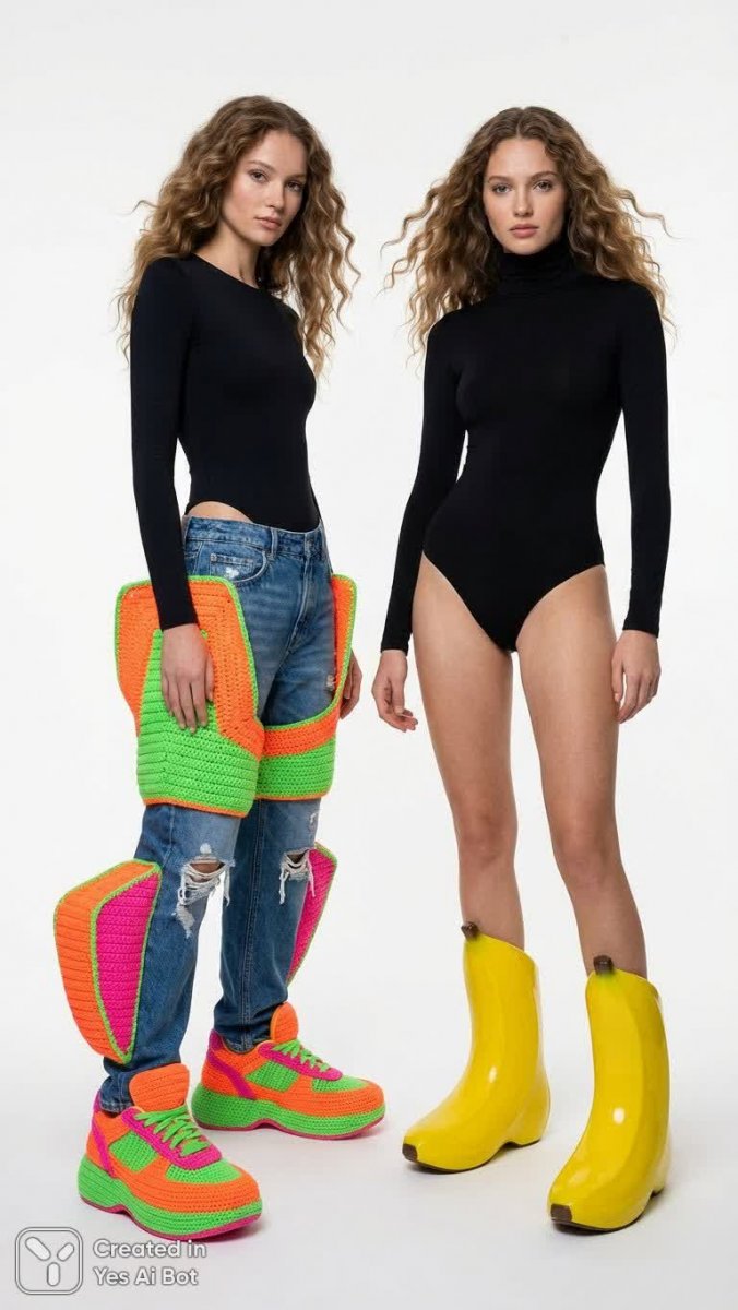 Выдающийся портрет демонстрирует дерзкий микс высокой моды и уличного стиля. В центре внимания – смелая дизайнерская работа с акцентом на необычный комплект одежды: яркие неоновые кроссовки ручной работы, контрастирующие с рваными джинсами, создают эффектный диссонанс. Необычные желтые ботинки в форме бананов добавляют экстравагантности и игривости образу. Гладкий черный боди подчеркивает силуэт модели, а ниспадающие волосы, уложенные мягкими волнами, придают портрету нежность и женственность. Фон нейтрального белого цвета позволяет полностью сосредоточиться на деталях и выразительности визуальной концепции. Стиль фотографии подчеркнут профессионализмом и вниманием к композиции, создавая яркий запоминающийся образ, который сочетает в себе элементы авангарда и повседневной жизни, демонстрируя смелые решения в области моды и дизайна. Это не просто фотография – это манифест индивидуальности и креативности, отражающий бунтарский дух современной эпохи и вдохновляющий на эксперименты с самовыражением через одежду и аксессуары. Вся концепция пронизана энергией и динамикой, приглашая зрителя окунуться в мир смелых образов и неординарных решений