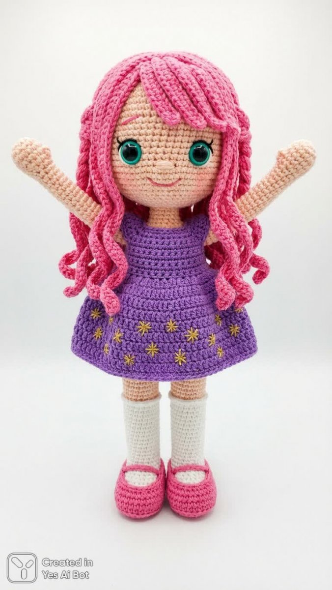 crocheted doll with wavy bright pink hair in two side braids, large teal eyes, wearing a purple dress with gold stars, white knee-high socks and pink ballet flats, cheerful expression, arms raised in excitement, BG is white.