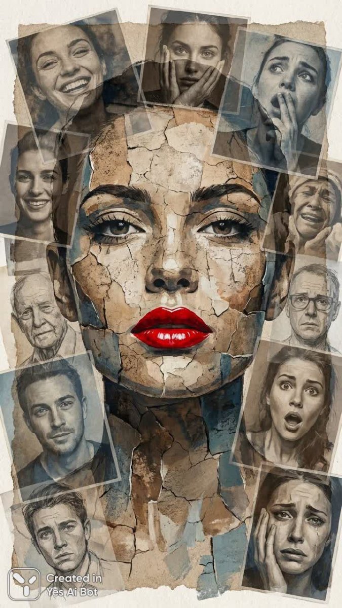 an artistic rendering displays a woman's face, bold red lipstick contrasting with a textured cracked aesthetic, surrounded by overlapping images depicting diverse expressions.