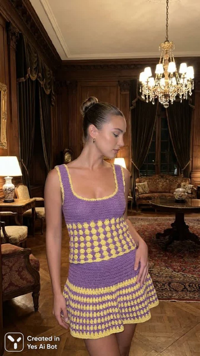 female model posing in luxurious room with high ceilings, wearing purple and yellow crochet two-piece outfit, flared pants and crop top with scoop neckline, hair styled in high bun, overall look elegant and sophisticated.