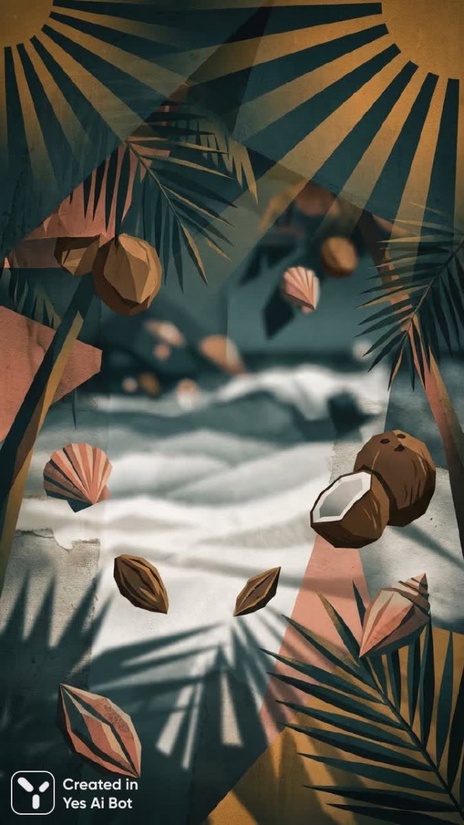 Яркая и динамичная композиция в стиле кубизма изображает тропический пейзаж, деконструированный на множество угловатых фрагментов. Пальмы и кокосы представлены в виде перекрывающихся плоскостей, насыщенных сочными оттенками бирюзового, шафранового и кораллового цветов. Стилизованные волны и лучи солнца исходят из углов изображения, создавая ощущение движения и энергии. Абстрактные тени добавляют глубину и объем, а парящие геометрические раковины и семенные стручки усиливают сюрреалистический эффект. Пропорции пальмовых листьев намеренно преувеличены, что подчеркивает игривый характер работы. Текстурные наложения холста и ручной вырезки бумаги создают богатую тактильную поверхность, а фон из мягко размытого белого песка придает изображению ощущение легкости и воздушности. Влияние Жана Мецингера, одного из ключевых представителей аналитического кубизма, проявляется в деконструкции форм и использовании геометрических элементов для создания сложной и гармоничной композиции. Использование компьютерной графики (cgi) позволяет достичь высокой детализации и точности цветопередачи, а разрешение 1024K обеспечивает кристально чистое изображение. Эта работа является ярким примером современного кубизма, сочетающего в себе традиции прошлого и инновационные технологии будущего, передавая зрителю ощущение тропического рая, переосмысленного через призму аналитического искусства