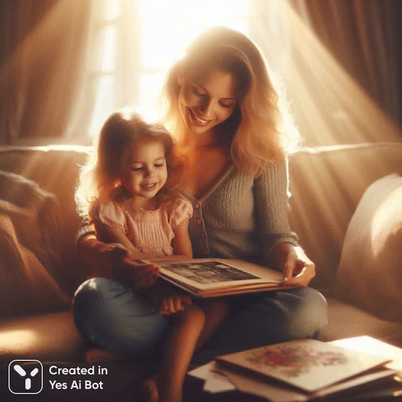 Нежная и трогательная фотография, пронизанная теплом материнской любви и детской привязанностью. Кадр запечатлел волшебный момент празднования Дня Матери: юная дочка и ее счастливая мама уютно расположились на диване, залитом мягким утренним светом, льющимся из окна. Они вместе перебирают старый фотоальбом, их руки нежно касаются пожелтевших страниц, пробуждая воспоминания и вызывая светлую грусть. В глазах мамы блестит слезинка радости, отражая всю глубину чувств к своей дочери. На переднем плане, в легкой размытости, лежат детали, создающие атмосферу домашнего уюта и тепла: детская открытка ручной работы с трогательной надписью 'Я люблю тебя, мамочка', недопитый чай из фарфоровой чашки и скромный букет свежих тюльпанов и ромашек. Вся сцена пронизана ностальгией по прошлому, искренней любовью и тихим семейным счастьем. Фотография выполнена в фотореалистичной манере с невероятной детализацией, используя профессиональное оборудование Canon EOS R5 и объектив 85mm. Мелкая глубина резкости и кинематографическое освещение добавляют изображению глубины и эмоциональности, подчеркивая созерцательность момента и передавая всю гамму чувств – от нежной радости до светлой печали. Это по-настоящему душевная фотография, способная вызвать самые теплые чувства в сердце зрителя, запечатлев мимолетную красоту материнской любви