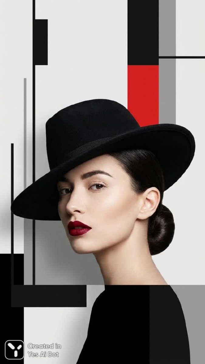 woman's face with bold red lipstick, wearing wide-brimmed hat tilted to side, hair in sleek style, BG is black and white striped, flat shapes combined with modern minimalism and a touch of red.