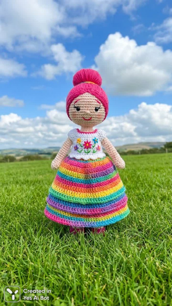 crocheted doll with pink hair styled in a bun, wearing white top with colorful flower patterns, long skirt made of layered rainbow yarn, cheerful expression on face, standing on a grassy field, BG features a blue sky with fluffy white clouds.