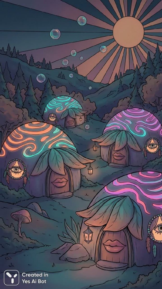 Волшебный мир фантазийных домиков оживает в этой захватывающей дух панорамной композиции. Представьте себе уютные грибные жилища, пропитанные атмосферой психоделических семидесятых годов, где реальность переплетается с мечтами и яркими образами. Купола крыш украшены причудливыми неоновыми узорами, создавая ощущение сказочного сияния в ночной тьме. Над домиками раскинулись навесы из гигантских лепестков, словно защищая их от невзгод и даря прохладу в жаркий день. Двери в виде задорных улыбающихся губ приветствуют каждого гостя, а окна-глаза, обрамленные бусинами и перьями, будто следят за происходящим вокруг. В воздухе кружатся невесомые мыльные пузыри, отражая разноцветные отблески ретро-солнца, которое ласково освещает этот волшебный мир своими лучами. Палитра радует глаз буйством оранжевых, бирюзовых и маджентовых оттенков, создавая атмосферу радости и беззаботности. Толстые линии туши придают композиции выразительность и глубину, а плавные цветовые переходы добавляют ей мягкости и нежности. Эта цифровая картина – настоящее произведение искусства, выполненное в стиле CGI с невероятной детализацией и высоким разрешением 1024K, позволяющим рассмотреть каждую мелочь этого удивительного мира фантазий и грез. Это приглашение окунуться в атмосферу волшебства, где нет места скуке и обыденности, а каждый уголок наполнен радостью и вдохновением
