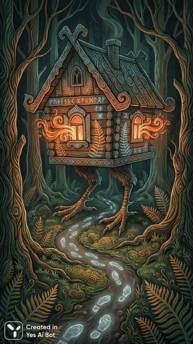 Узорчатый рисунок, избушка Бабы Яги на курьих ножках, стены украшены светящимися рунами и стилизованными папоротниками, окна горят огненными орнаментами, тропинка мерцающих следов, лес насыщенного изумруда и меди, выразительные световые линии, cgi, 1024K