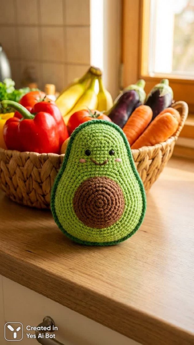 funny crocheted avocado toy with a cute smile, brown pit resembling a face, sitting on a kitchen counter, colorful fruit and vegetables in the background, creating a cheerful and vibrant atmosphere.