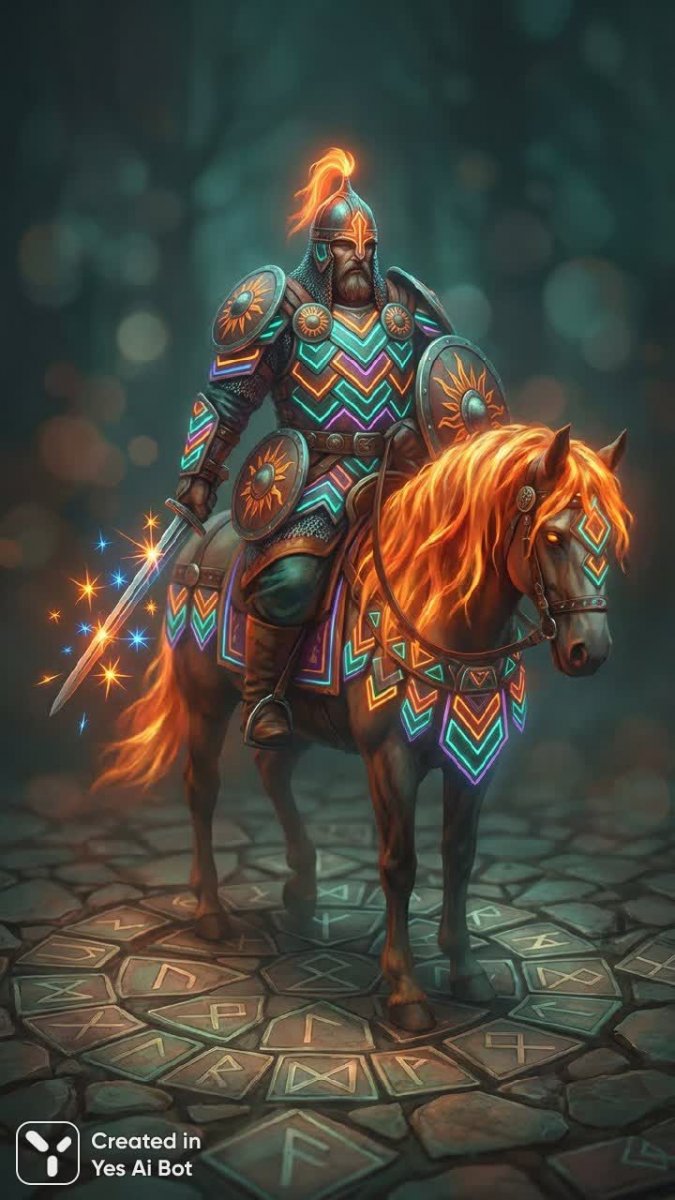 Эпическое полотно, сотканное из света и силы, представляет собой завораживающую сцену из славянского эпоса. В центре композиции – могучий богатырь, чья фигура излучает непоколебимую уверенность. Его доспехи поражают воображение: сложная конструкция из перекрывающихся неоновых зигзагов и солнечных щитов создает эффект динамичного сияния. Воин восседает на боевом коне с развевающейся гривой, пылающей оранжевым пламенем, что подчеркивает его свирепый нрав и готовность к битве. Под копытами коня простирается земля, украшенная геометрическими руническими плитками, словно древние символы силы и защиты. От обнаженного меча богатыря разлетаются искры в форме звезд, добавляя сцене драматизма и мистической глубины. Яркие фольклорные цветовые блоки создают насыщенную палитру, перенося зрителя в мир сказочных преданий и легенд. Использование современных технологий CGI позволило создать невероятно реалистичное изображение с потрясающим уровнем детализации. Разрешение 1024K гарантирует кристальную четкость каждой линии и оттенка, позволяя полностью погрузиться в атмосферу древнерусского героизма и волшебства. Картина словно оживает, демонстрируя мощь, красоту и величие богатырской эпохи, переданные с помощью инновационных цифровых инструментов. Это визуальное представление славянского мифа, сочетающее в себе традиционную эстетику и современные технологии для создания поистине незабываемого произведения искусства