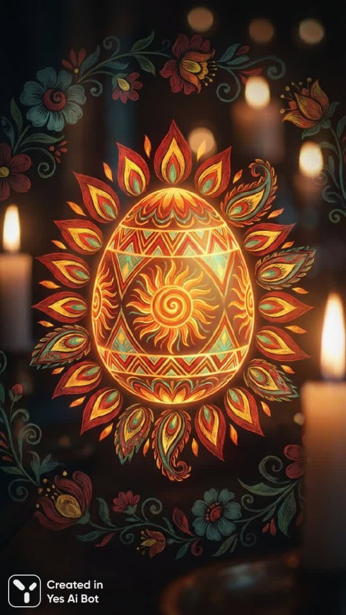 Яркая иллюстрация в народном стиле, изображающая радостного Жар-птицу с яйцом, окутанным сиянием огненных лепестков. Дизайн яйца украшен витиеватыми узорами пейзли и солнечными лучами, а его оболочка искусно выгравирована светящимися геометрическими орнаментами. Вокруг великолепия Жар-птицы и её яйца танцуют пышные цветочные гирлянды, создавая атмосферу праздника и изобилия. Цветовая палитра сочетает в себе жизнерадостный лимонный желтый, насыщенный вишневый красный и свежий аквамарин, усиливая общее впечатление тепла и энергии. Использование компьютерной графики (cgi) обеспечивает невероятную детализацию и реалистичность изображения, создавая захватывающий визуальный опыт с разрешением 1024K. Эта иллюстрация — настоящий гимн красоте народных традиций, мастерству исполнения и ярким краскам, способный подарить зрителю ощущение восторга и удивления. В ней переплетаются элементы фольклорного искусства, сложной геометрии и природной гармонии, создавая неповторимый образ, полный символизма и вдохновения. Кажется, будто из этой иллюстрации веет теплом солнечного дня и волшебством древних легенд