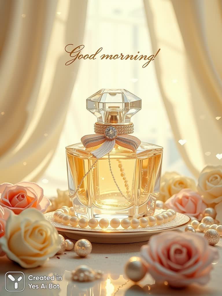 Изысканный флакон духов – сердце этой композиции, воплощающее в себе элегантность и роскошь. Геометрические формы прозрачного стекла деликатно подчеркивают насыщенный янтарный оттенок заключенной внутри парфюмерной жидкости. Вершина флакона украшена кристаллами бриллиантов, играющими светом и придающими изделию неповторимую ценность. Нежная нить жемчуга изящно обвивает горлышко флакона, добавляя шарма и утонченности. В передней части красуется декоративный бант с сияющим камнем в центре, усиливая общее впечатление роскоши. Флакон покоится на белоснежной тарелке с золотой окантовкой, словно подчеркивая его значимость. Вокруг флакона расположились множество пастельных роз нежных оттенков – от мягкого розового и кремового до розоватых тонов, создающих романтическую атмосферу и наполняющие пространство чувственностью. За флористической композицией ниспадают мягкие кремовые драпировки, формируя роскошный фон и добавляя ощущение уюта и комфорта. Весь ансамбль окутан мягким рассеянным светом, создающим теплую и располагающую атмосферу. Изящно написанная надпись 'Доброе утро!' в верхней части изображения усиливает праздничное настроение и придает картине легкость и беззаботность. Стиль сочетает в себе элементы реализма с легким налетом фантазии, стремясь к созданию мечтательного, роскошного эстетического образа, который вызывает чувство восхищения и вдохновения, погружая зрителя в мир изысканной красоты и утонченности. Этот образ наполнен гармонией и спокойствием, идеально подходящий для создания атмосферы праздника и радости