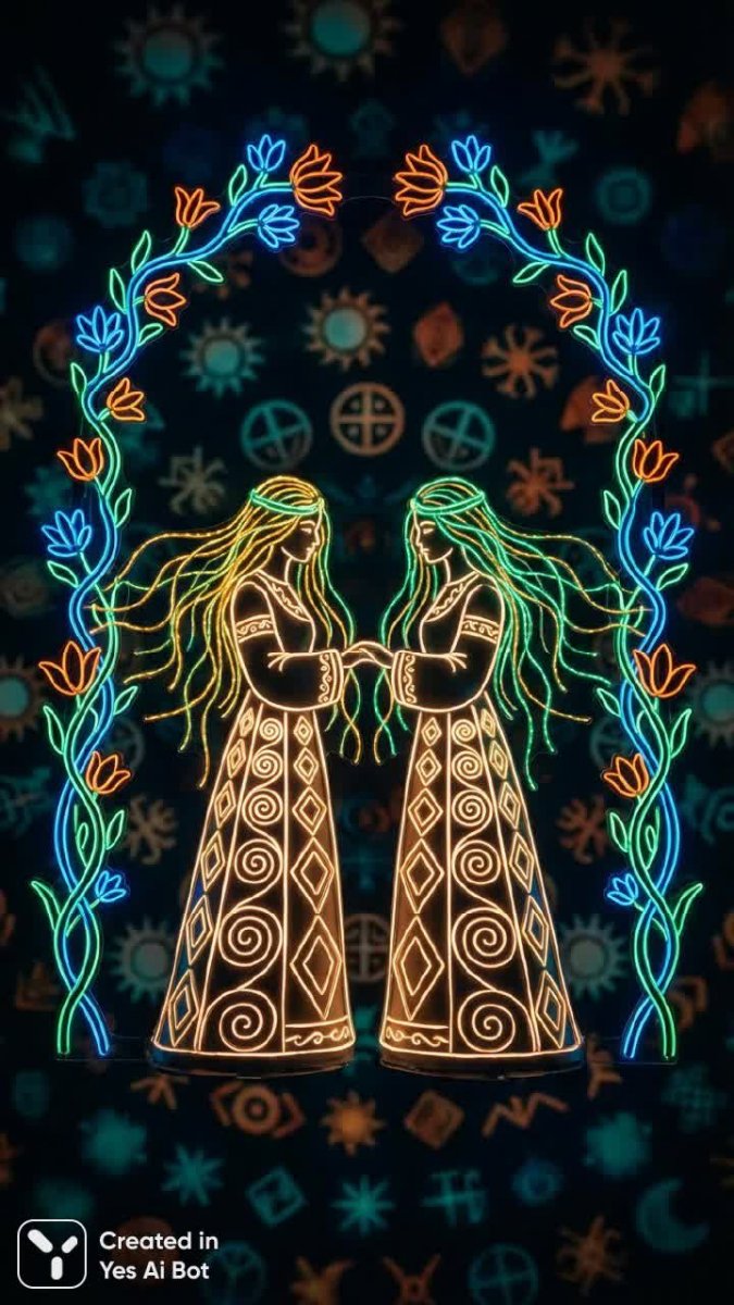 Волшебная встреча двух берегинь в сияющем цифровом мире. Это завораживающее произведение искусства сочетает в себе смелость и легкость, представляя собой два славянских покровителя, окруженных симметричными арками из переплетенных цветочных узоров. Их платья излучают свет, украшенные стилизованными спиралями и бриллиантами, а волосы превращаются в струящиеся лозы золотого и изумрудного света. Фон оживает благодаря пульсирующим мотивам народных символов солнца и земли, создавая ощущение глубокой связи с древними традициями. Каждая деталь проработана с невероятной тщательностью, демонстрируя мастерство компьютерной графики в разрешении 1024K. Композиция излучает энергию и гармонию, перенося зрителя в мир славянской мифологии, где красота природы сливается с силой духа. Это не просто изображение – это визуальная поэма о защите, мудрости и вечном круговороте жизни. Картина словно дышит, наполняя пространство таинственным светом и древней энергией, приглашая зрителя прикоснуться к корням славянской культуры. Яркие цвета, плавные линии и детализированная проработка создают эффект полного погружения в волшебный мир берегинь, делая это произведение искусства поистине незабываемым зрелищем. Это визуальное воплощение славянского духа, переосмысленное с помощью современных технологий