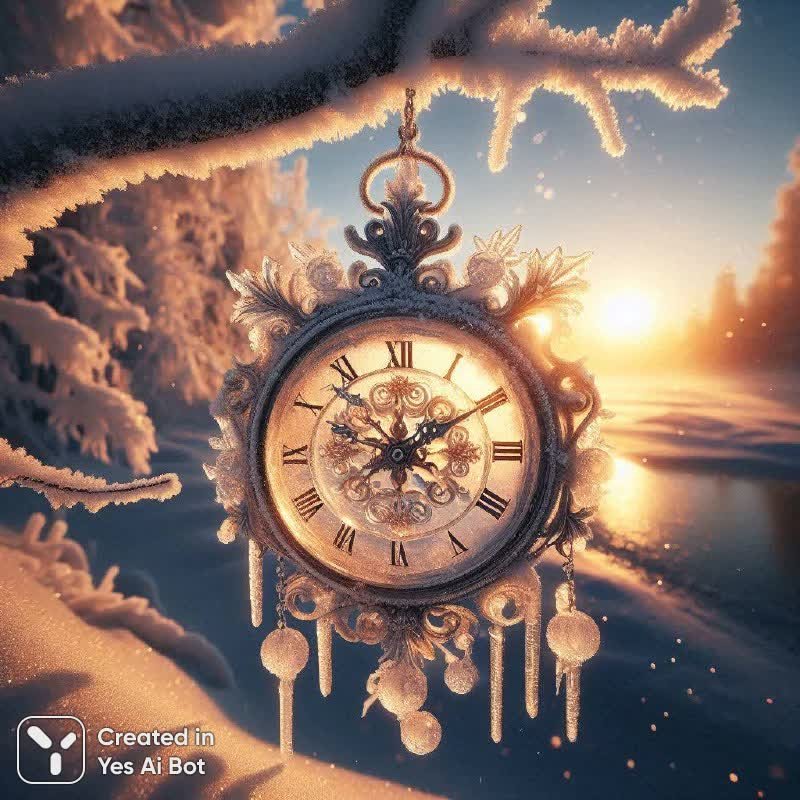 На обледеневшей ветке дерева висят прозрачные ледяные часы, утреннее солнце отражается в циферблате. Идет пушистый снег. Раннее утро, теплый свет.