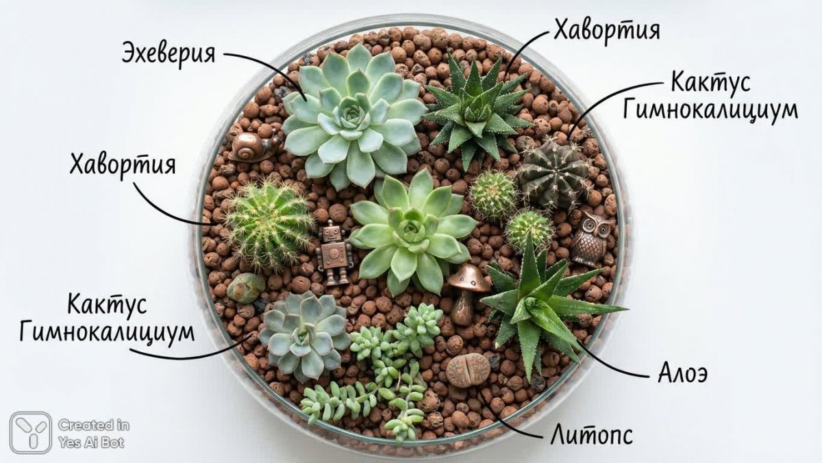 Суккуленты разных видов и кактусы посажены в лечаза пон, садик из суккулентов, флорариум, вид сверху, инфографика с подписями видов на русском языке, рядом с суккулентами и кактусами разнообразные фигурки из меди или латуни