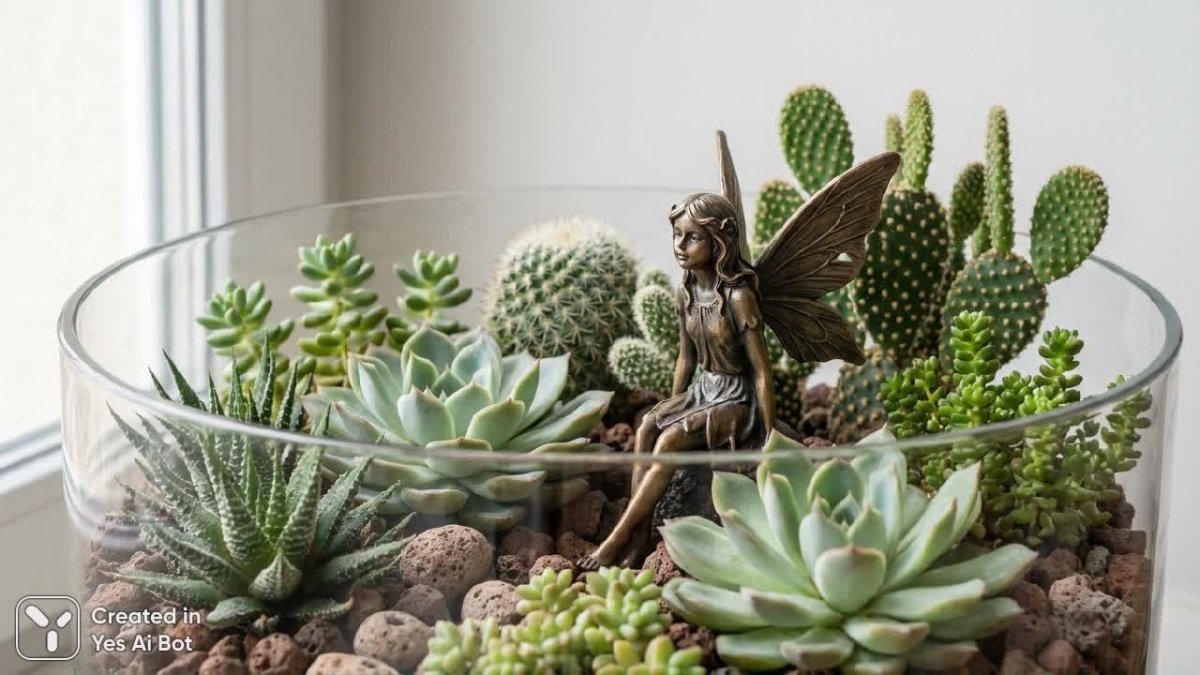 Миниатюрный сад кактусов и суккулентов в флорариуме с бронзовой феей. Генерация из нейросети NanoBanana