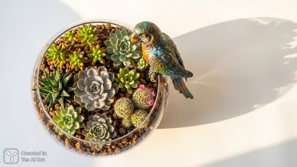 Фотография демонстрирует изысканную композицию, состоящую из разнообразных суккулентов и кактусов, расположенных в стильном флорариуме Lechaza pon. Растения отличаются богатой палитрой форм и оттенков и выгодно выделяются благодаря белому фону, который подчеркивает их красоту и чистоту. Неожиданным элементом является яркая бронзовая фигурка попугая, добавляющая динамичности и игривости изображению за счет отражения света и насыщенных цветов. Динамическое освещение создает сложные тени внутри флорариума, придавая снимку глубину и объем. В целом, фотография представляет собой тщательно продуманное произведение искусства, сочетающее в себе природную красоту растений с художественным видением фотографа и вниманием к деталям. Изображение излучает спокойствие, гармонию и позитивные эмоции, что делает его прекрасным украшением для интерьера и источником вдохновения для ценителей экзотической растительности и современного дизайна, созданное нейросетью Nano Banana v.1.0 Pro.