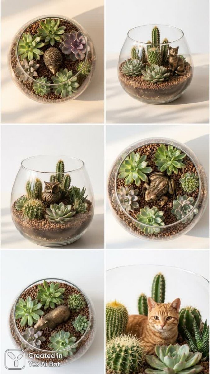 Миниатюрные сады: суккуленты, кактусы и бронзовые фигурки в флорариумах Lechaza po. Генерация из нейронной сети NanoBanana