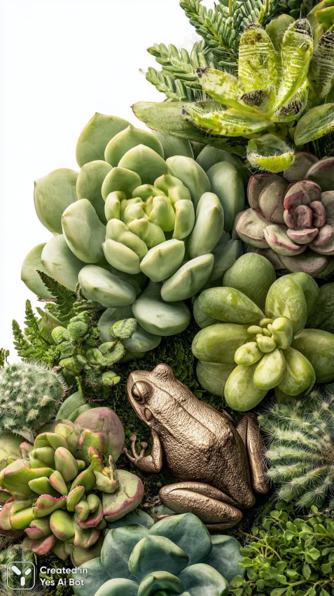 professional photo an artistic arrangement of various succulent plants and cacti in a lechaza pon florarium viewed from above on a pristine white background. a charming bronze frog with a lifelike detail rests beside vivid greens, dramatically illuminated by a spotlight casting bold shadows that enhance visual impact.