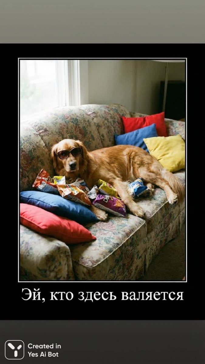 demotivator, photo on film, black frame, text in white letters on the black frame: "Эй, кто здесь валяется?", a lazy dog sprawled on a couch, wearing oversized sunglasses, surrounded by snack wrappers. Brightly colored cushions add a playful touch.