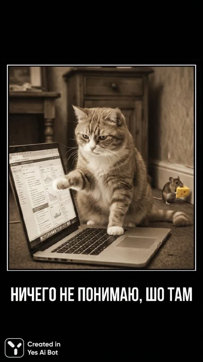 Забавный депрессивный комикс в стиле демтиватора запечатлен на пленке и оформлен в строгую черную рамку. В центре внимания – очаровательный, но растерянный кот, который с недоумением смотрит на экран ноутбука, пытаясь разобраться в происходящем. Его лапа тянется к мерцающему экрану, выражая полное непонимание ситуации и заставляя зрителя задуматься о том, что же там такого интересного. Сцена дополняется комичным моментом: пока кот увлеченно пытается понять виртуальный мир, хитрый мышонок бесцеремонно крадет аппетитный кусочек сыра, не обращая на кошачью растерянность никакого внимания. Контраст между сосредоточенностью кота и дерзостью мыши создает забавную ироничную атмосферу. Изображение подчеркивает ощущение абсурдности ситуации и добавляет юмора благодаря подписи выполненной белыми буквами на черном фоне: 'Ничего не понимаю, шо там?'. Это визуальное повествование сочетает в себе элементы комедии и меланхолии, заставляя улыбнуться над повседневными неудачами и неожиданностями. Использование пленки добавляет винтажности и ностальгической атмосферы, усиливая общее впечатление от работы. Это отличный способ передать чувство растерянности в юмористическом ключе и напомнить о том, что иногда лучше просто наблюдать за происходящим, не пытаясь все понять