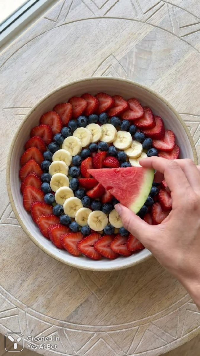 bowl of colorful fruit salad with strawberries, blueberries, and bananas, hand reaching for a slice of watermelon, vibrant colors arranged artistically, BG is light wooden table surface with subtle patterns.
