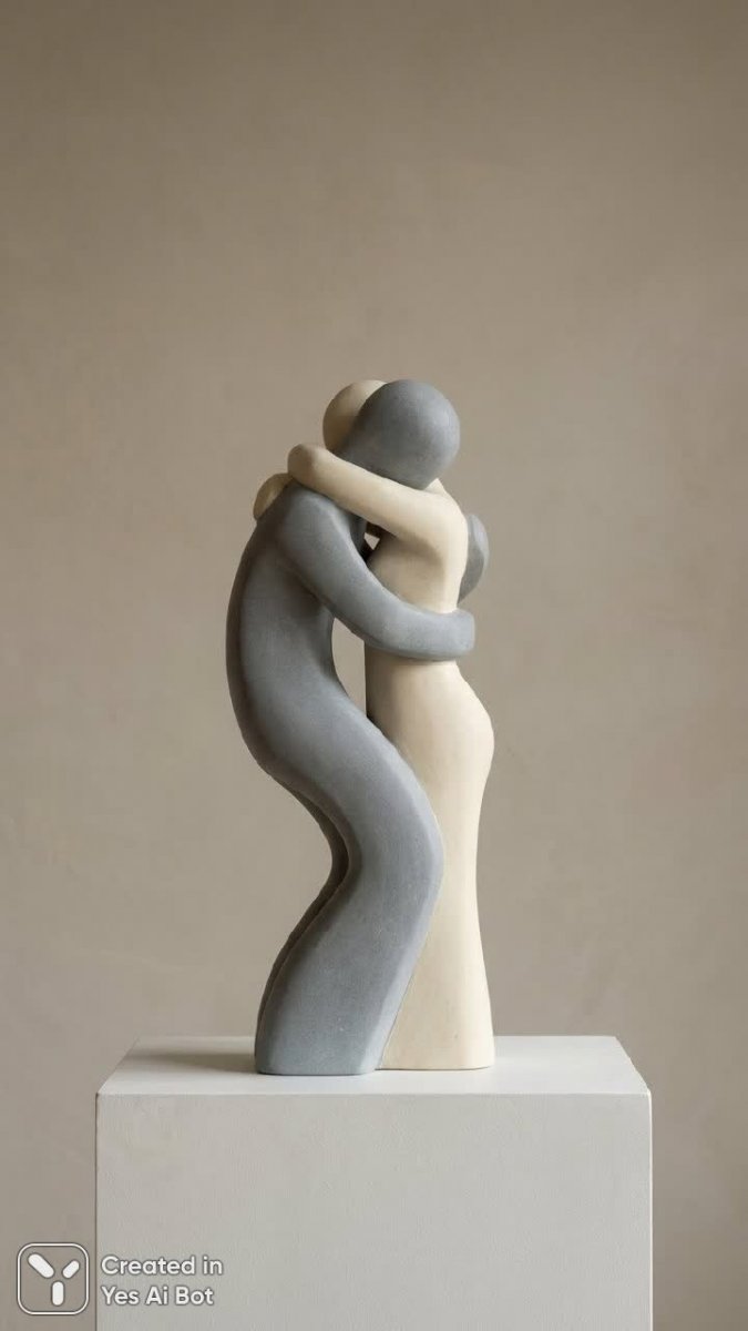 Изящная скульптура, воплощающая идею единства и гармонии, представляет собой две фигуры, словно переплетенные в неразрывном танце. Левая фигура выполнена в спокойных серых тонах, добавляя образу глубину и загадочность. Обе фигуры уверенно стоят на лаконичной белой основе, которая подчеркивает чистоту линий и формы композиции. Фон нейтрального бежевого цвета не отвлекает внимание от главного объекта, позволяя полностью погрузиться в созерцание этой выразительной работы искусства. Скульптура излучает атмосферу спокойствия, взаимоподдержки и нерушимой связи между двумя сущностями. Она словно запечатлела момент глубокой эмоциональной близости и духовного единения, приглашая зрителя задуматься о силе человеческих отношений и ценности совместного пути. Сдержанная цветовая палитра и минималистичный фон создают ощущение элегантности и утонченности, делая эту скульптуру настоящим произведением искусства, способным вдохновлять и пробуждать самые светлые чувства. Эта работа является метафорой взаимопонимания и поддержки в любых жизненных обстоятельствах