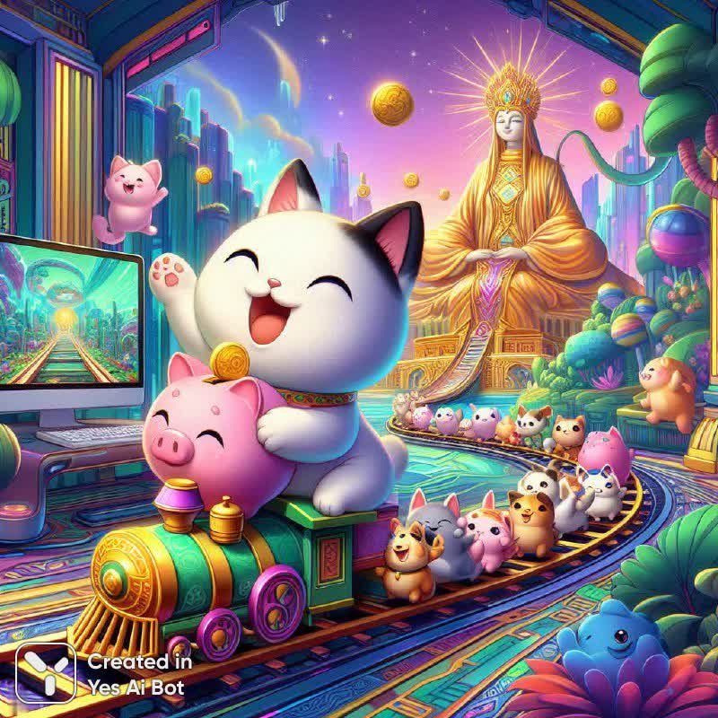 Игривая сцена, где очаровательный котенок, словно маленький машинист, управляет крошечной железной дорогой. Его пассажиры – забавные зверята и свинья-копилка, полные обаяния и непосредственности. Весь этот волшебный караван направляется под чутким присмотром богини Фортуны, которая обещает удачу и благополучие каждому путешественнику. За причудливым движением поезда открывается захватывающий дух футуристический пейзаж, где переплетаются фантастические элементы с современными технологиями, символизируемыми персональным компьютером. Вся композиция выполнена в ярком и динамичном стиле 2D анимации, создавая ощущение легкости и безграничной фантазии. Этот рисунок – настоящее воплощение фантазии и футуризма, сочетающее в себе теплоту домашнего уюта и дерзость инновационных технологий. Он переносит зрителя в сказочный мир, где даже самые обыденные вещи обретают необыкновенный смысл и красоту. Это визуальный гимн радости, оптимизму и бесконечным возможностям, которые открываются перед нами на пути к мечте. Каждая деталь этой картины продумана до мелочей, чтобы подарить зрителю незабываемые впечатления и вдохновить на новые свершения. Сцена излучает позитивную энергию и дарит ощущение волшебства, словно приглашая нас окунуться в мир грез и фантазий