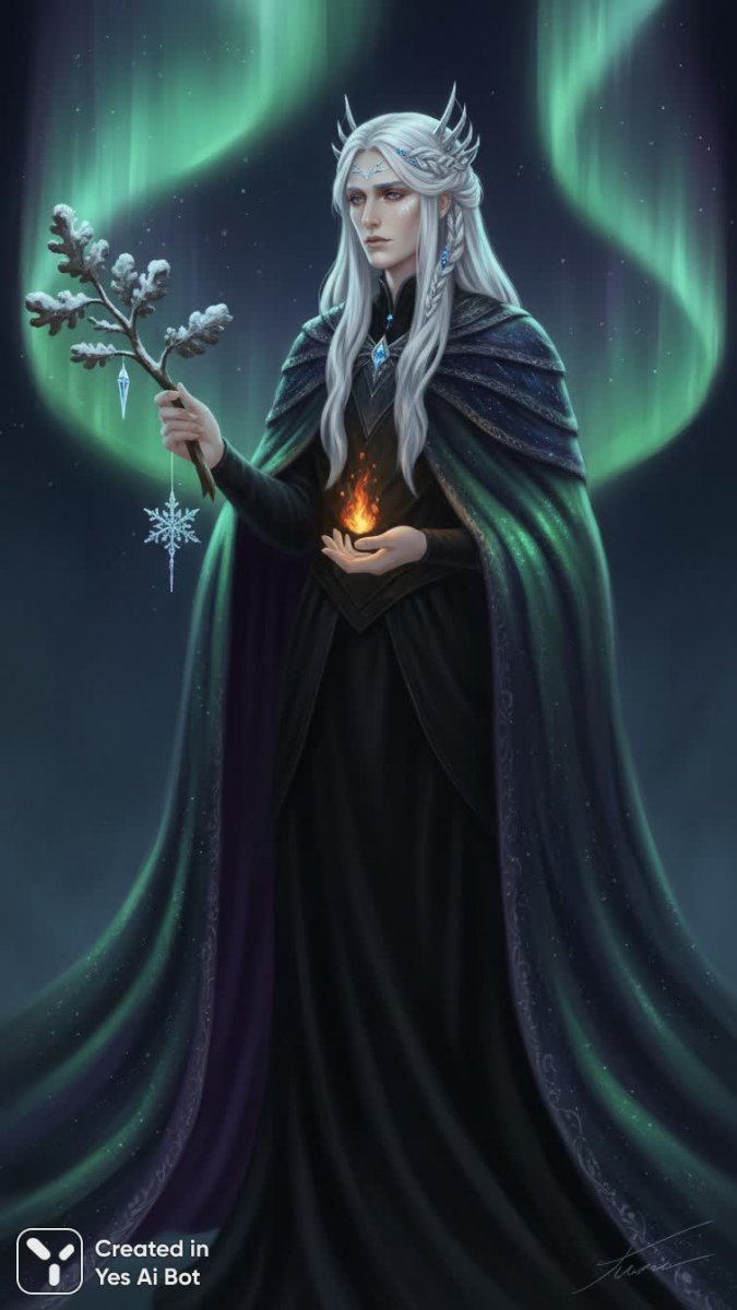 Portrait of December personified as a majestic, androgynous human. They are the quiet ruler of the year's end. Long, frost-white hair woven with strands of deep blue and silver, like a frozen night sky. Their cloak is made of swirling Northern Lights (aurora borealis), shimmering with greens and purples over a gown of dark velvet. In one hand, they hold a bare oak branch adorned with a single, fragile icicle and a crystal snowflake. In the other, a tiny, glowing ember — the promise of the returning sun. Their expression is serene, wise, and slightly melancholic. Skin is pale with a faint, cold glow. Style: epic digital painting, character con...