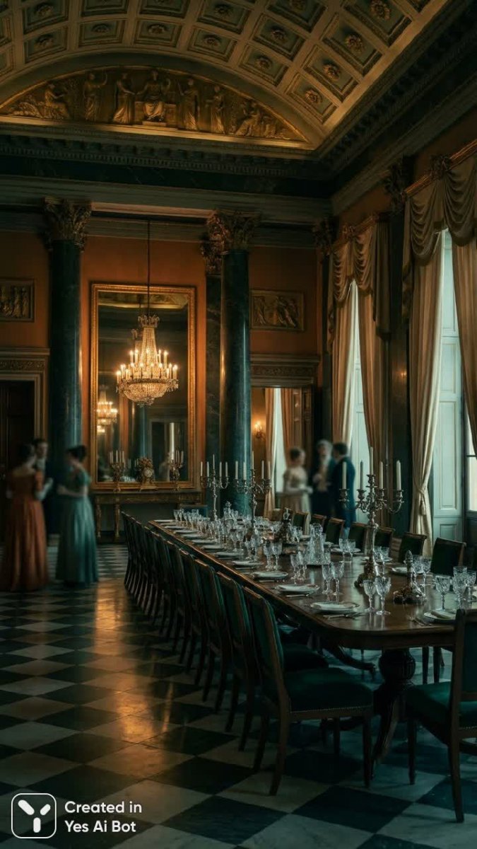 Large neoclassical dining hall, towering marble columns, coffered ceilings adorned with golden reliefs, long walnut banquet table set with silver candelabras and crystal, high-backed velvet chairs in deep emerald, checkerboard marble floor, massive gilded mirror reflecting grand chandelier, towering floor-to-ceiling drapes in champagne silk, subtle murmur of refined conversation, style of Jean-Auguste-Dominique Ingres, early 1800s, cgi, 1024K