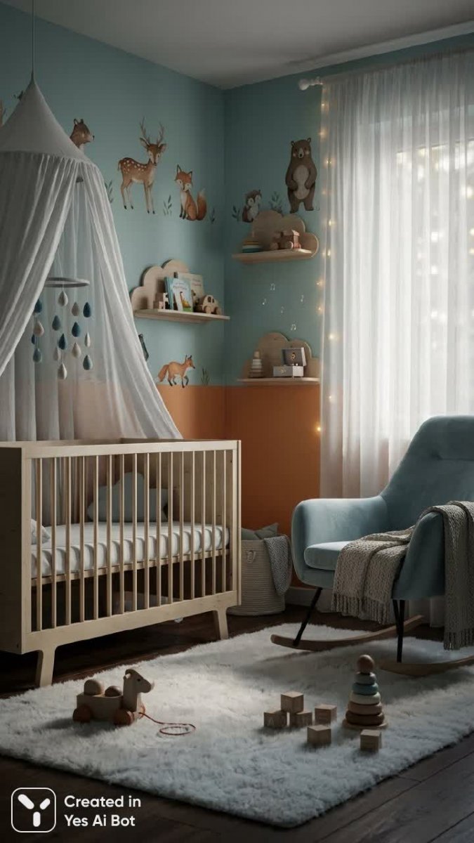 Scandinavian-inspired nursery, soft pastel walls with hand-painted forest animals, cloud-shaped shelves, plush woolen rug in snow white, minimalist birch crib with linen canopy, mobiles of felted raindrops, rocking chair in pale blue velvet, scattered wooden toys, faint lullaby from music box, sunlight filtered through gauzy curtains, style of contemporary Nordic design, 2020s, 1024K