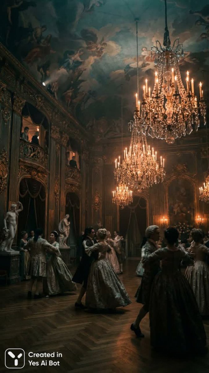 Величественный бальный зал эпохи позднего барокко поражает воображение своим великолепием и изысканностью. Высоченный сводчатый потолок украшен фресками, словно оживающими под лучами света, а стены, обитые позолотой в стиле рококо, создают атмосферу роскоши и утонченности. Массивные хрустальные люстры, искрящиеся тысячами свечей, наполняют пространство мягким, теплым сиянием, отражающимся от глянцевого паркета 'елочкой'. Бархатные драпировки балконов добавляют ощущение комфорта и изысканности, а мраморные статуи мифологических героев придают залу монументальность и величие. В вихре движений элегантно одетые танцоры кружатся в ритме волшебного вальса, словно сошедшего со страниц истории. Музыка оркестра наполняет пространство мелодиями, переносящими зрителя в эпоху барокко. Стиль живописи Джованни Баттиста Тьеполо находит свое отражение в каждой детали интерьера, создавая ощущение легкости и воздушности. Этот великолепный зал, словно застывший во времени кадр из 1740-х годов, является воплощением красоты и гармонии, свидетельством эпохи расцвета искусства и культуры. Каждое движение, каждый отблеск света, каждая деталь интерьера рассказывают историю о великолепии и роскоши того времени, приглашая зрителя окунуться в мир элегантности и изысканности. Это не просто зал – это портал в прошлое, где царит музыка, танец и вечная красота