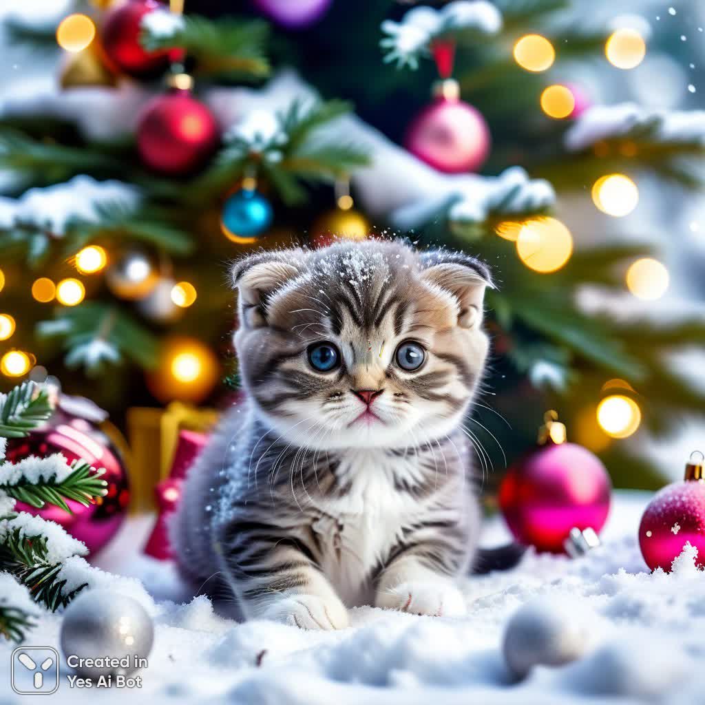 Милый шотландский котёнок с загнутыми ушками, пухлый и очаровательный, уютно расположился под заснеженной елью в праздничной новогодней обстановке. Фотография выполнена профессионалом с высочайшим вниманием к деталям – крупный план позволяет рассмотреть каждый волосок на его мягкой шерстке. Композиция построена снизу вверх, что придает изображению особое очарование и масштабность. Палитра цветов нежная и гармоничная: преобладают оттенки серого, голубого, мягкого оливкового, серебристого, бежево-сиреневого, светло-голубого и розового, создавая ощущение спокойствия и уюта. Изображение выполнено в разрешении 8K, что гарантирует потрясающую четкость и реалистичность каждой детали, позволяя полностью погрузиться в атмосферу волшебства и нежности этого зимнего чуда. Это идеальный способ привнести немного праздничного настроения и милоты в ваш дом или офис – фотография излучает тепло и создает ощущение сказочной гармонии с природой. Почувствуйте магию новогодних дней, наблюдая за этим очаровательным котенком, окруженным зимней красотой и праздничным декором. Это больше, чем просто фото - это кусочек счастья и уюта, который согреет вас в самые холодные дни