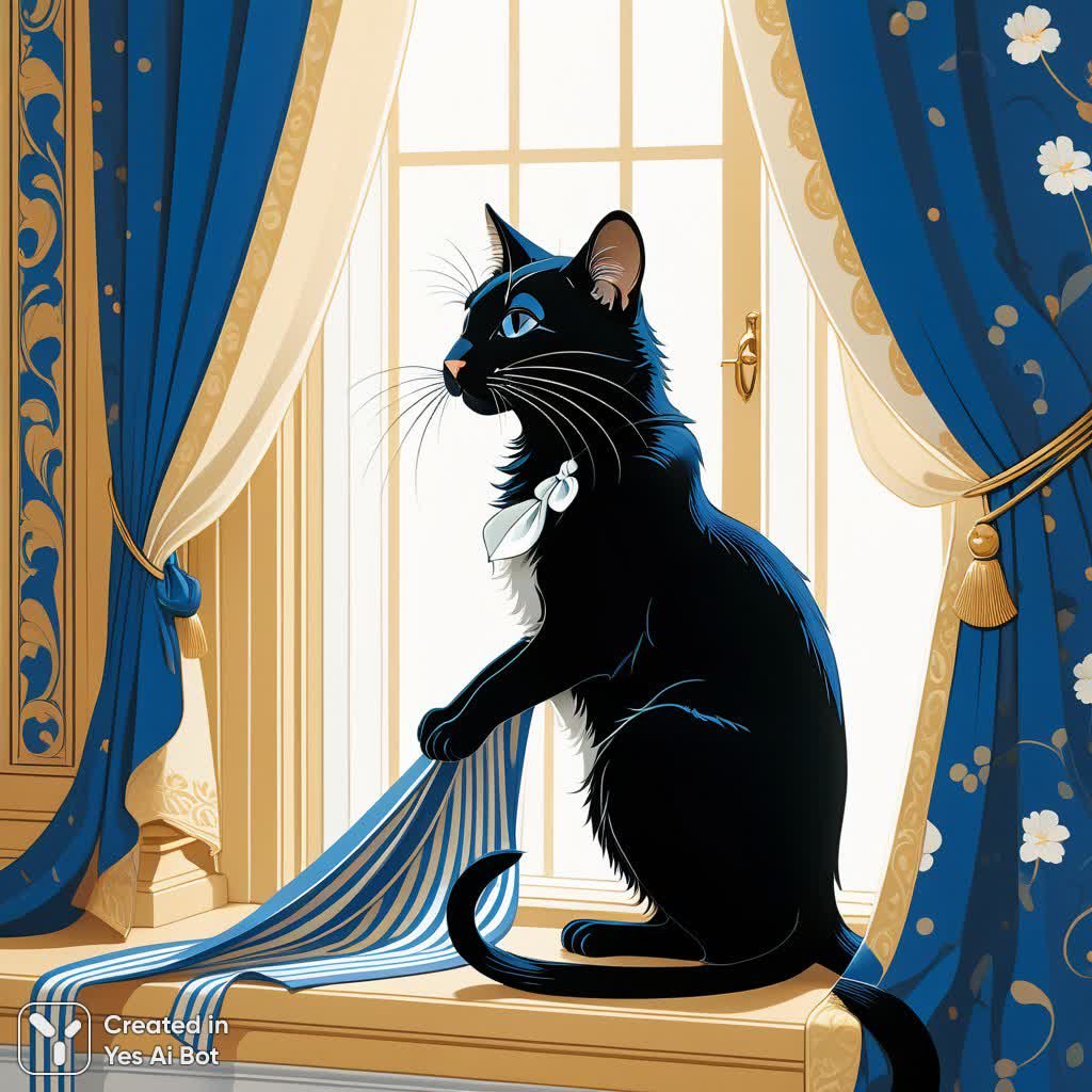 Задумчивый момент в уютной комнате: стальной синий подоконник служит сценой для трогательной встречи. Маленькая мышка, полная печали, сидит на краю, а над ней возвышается огромный, мультяшный черный кот с длинной шеей и крошечной головой. Его густой хвост гордо поднят вверх, а выразительные белые глаза смотрят с легкой тревогой. Кот, словно признавая страдания мыши, протягивает ей белоснежный платочек из своих усов-усами. За ними развешаны полосатые занавески, а стены украшены светлым бежевым обоем, создающим атмосферу домашнего тепла и спокойствия. Вся сцена выдержана в узнаваемом стиле Роберта Скоттона, известного своими милыми и юмористическими иллюстрациями, но с добавлением элегантности и изящества Эрте, что придает картине особую глубину и шарм. Изометрический вид позволяет зрителю рассмотреть все детали композиции, а чистые линии и графическое исполнение подчеркивают лаконичность и ясность изображения. 2D-иллюстрация передает легкость и воздушность сцены, делая ее привлекательной для самых разных зрителей. Это трогательная история о сочувствии и утешении, рассказанная с помощью ярких цветов и запоминающихся персонажей