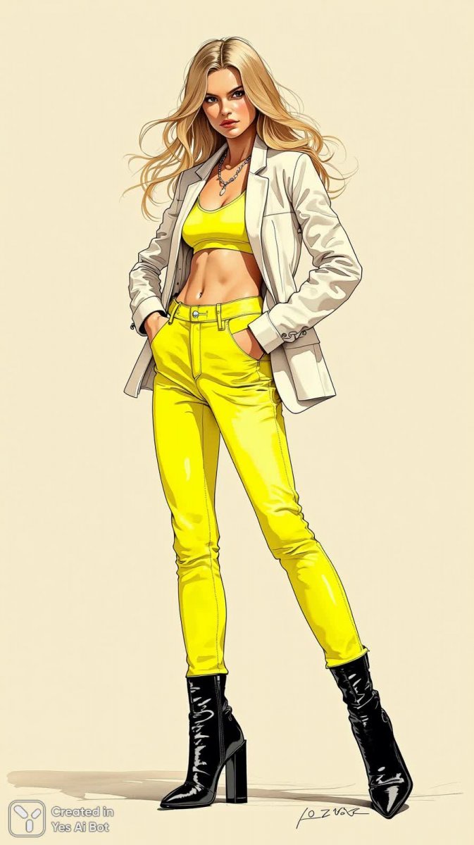 Яркая и стильная иллюстрация в технике чернильного рисунка представляет собой модную модель, запечатленную в студии на фоне неоновых цветов. Образ дополняют эффектные черные ботильоны на массивном каблуке, подчеркивающие элегантность и современный вкус. Высокая посадка брюк создает гармоничный силуэт, а непринужденное выражение лица модели придает портрету естественности и живости. В качестве акцента в кадре присутствуют желтые туфли на высоком каблуке, добавляющие динамики и контраста общему визуальному восприятию. Эта работа демонстрирует мастерство художника в передаче деталей моды и создания атмосферы яркой и запоминающейся эстетики. Иллюстрация идеально подойдет для рекламных кампаний в сфере fashion или для оформления тематических публикаций, привлекающих внимание своей оригинальностью и стильным исполнением. Каждая деталь тщательно проработана, от текстуры чернил до насыщенности неоновых оттенков, что делает изображение по-настоящему уникальным произведением искусства. Композиция отличается балансом между динамикой и спокойствием, создавая ощущение уверенности и индивидуальности. Этот образ воплощает дух современной моды и вдохновляет на создание новых трендов