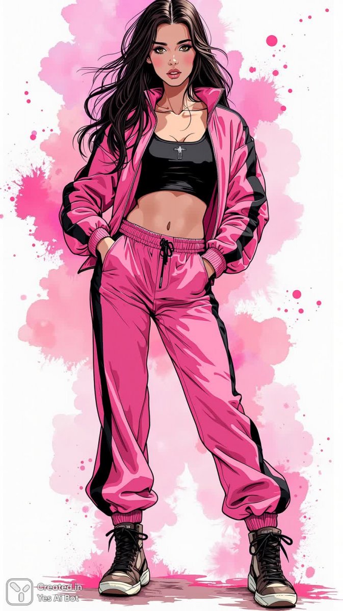 illustration, ink drawing, fashion model, neon colors posing in full body shot, pink and black tracksuit with high waist, energetic and edgy atmosphere, long dark hair styled in loose waves.